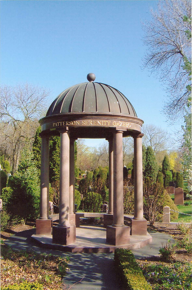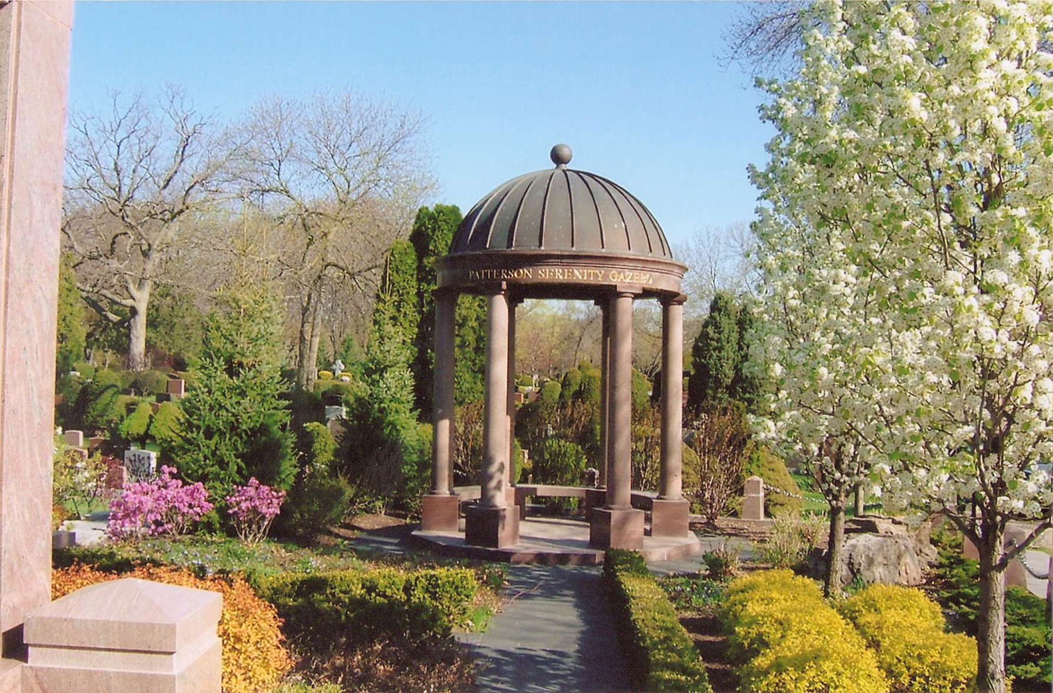 Benches link the pillars for the comfort of cemetery visitors when they stop to rest and reflect.
